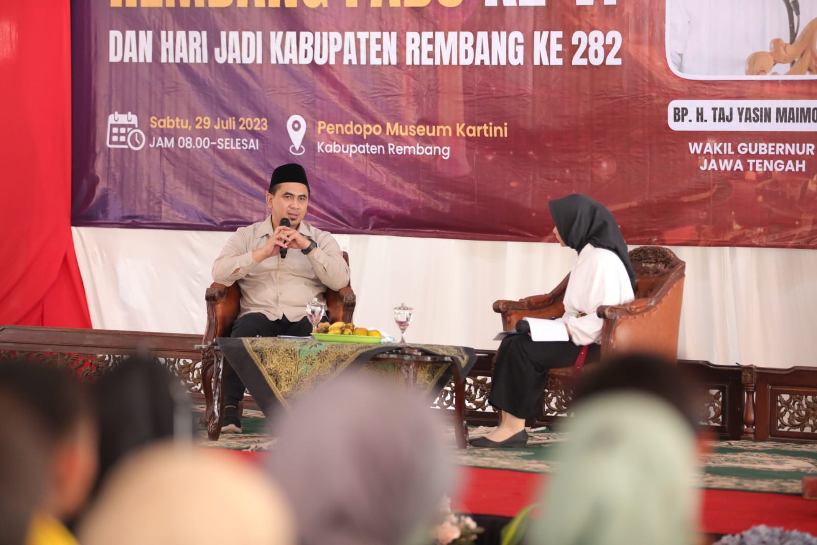 REMBANG – Wakil Gubernur Jawa Tengah, Taj Yasin Maimoen, mengajak pelajar turut membantu membangun daerah masing-masing. Hal itu disampaikan wagub saat menghadiri puncak Anniversary Rembang FABS ke-VI Forum Anak Beasiswa Rembang serta Hari Jadi ke-282 Kabupaten Rembang, di Pendopo Museum Kartini Rembang, Sabtu (29/07/2023). Menurutnya, kontribusi anak muda sangat diperlukan demi menyongsong Indonesia Emas di tahun 2045 mendatang.