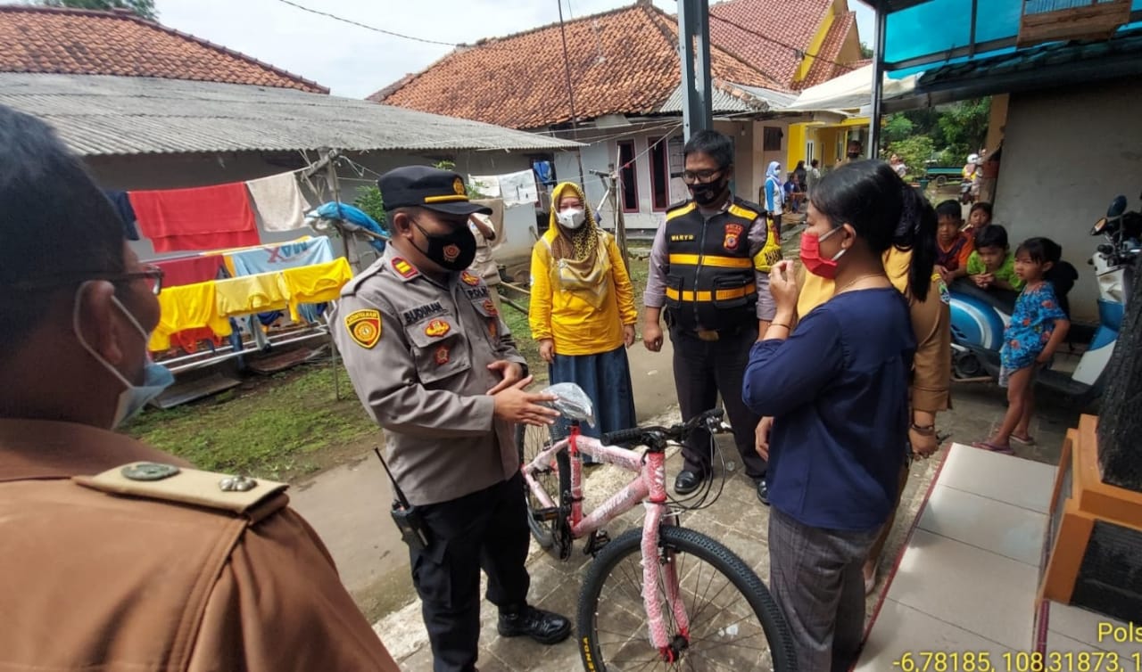 Wujud Pelayanan Kepada Masyarakat, Wakapolsek Sukahaji Polres Majalengka IPTU Budiman bersama aparat Desa mengantarkan langsung kerumah pemenang Dorprize Vaksinasi berupa satu Unit Sepeda Angin kepada Sdri Yati Suryati Alamat Blok Wage RT 07 RW 04 Desa Jayi Kecamatan Sukahaji Kabupaten Majalengka. Selasa (8/3/2022) pagi.