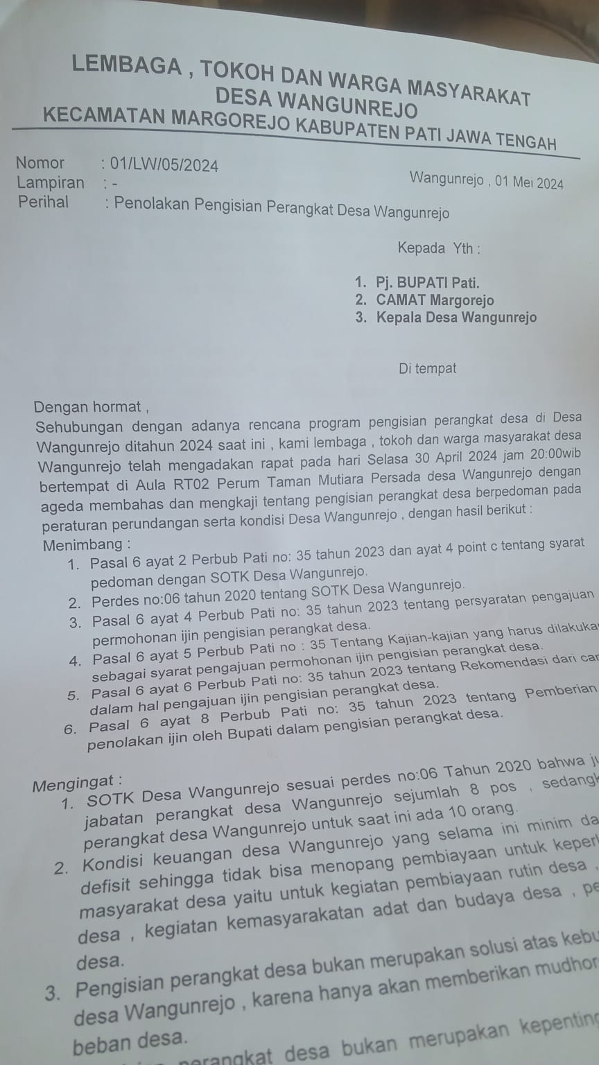 Bahwa pengisian perangkat desa bukan merupakan solusi atas kebutuhan masyarakat desa Wangunrejo. Pengisian perangkat desa tidak layak dan tidak memenuhi syarat untuk dilakukan pada saati ini, pemdes dan parades Wangunrejo agar melaksanakan program program yang lebih penting dan dibutuhkan oleh warga masyarakat desa Wangunrejo,” kata ketua RW 01 / 02 yang diwakili oleh Makruf Durri & Imam Samioen.